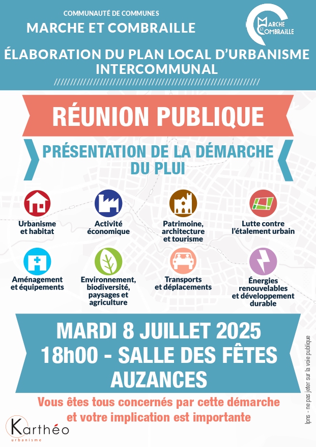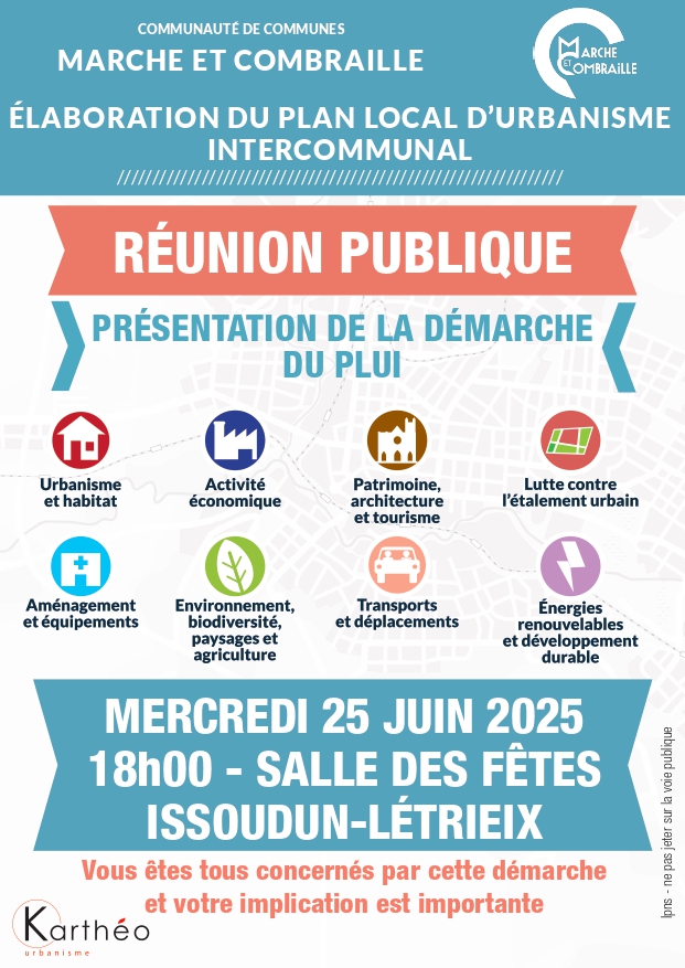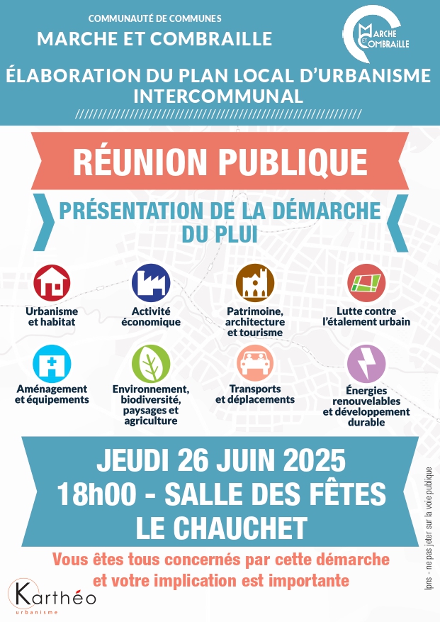 La communauté de communes Marche et Combrailles vous invitent à plusieurs réunions publiques concernant l’élaboration du Plan Local d’Urbanisme Intercommunal :